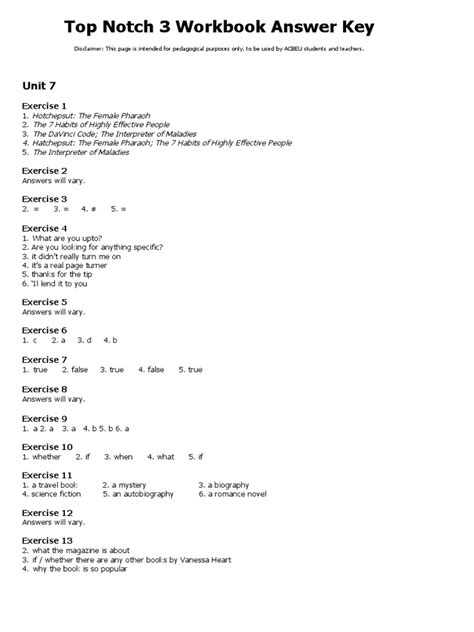 Read Online top notch workbook answer key unit 7 Epub online is a convenient and frugal way to read top notch workbook answer key unit 7 you love right from the comfort of your own home. Yes, there sites where you can get Epub "for free" but the ones listed below are clean from viruses and completely legal to use.